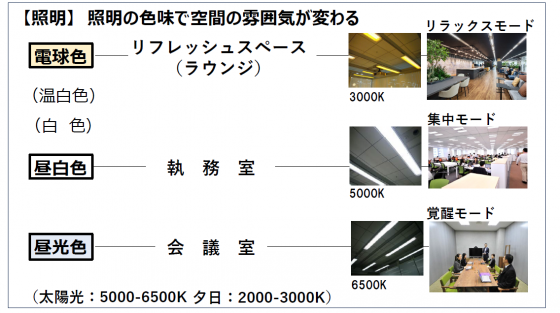 オフィス空間の雰囲気を変えるやり方として照明の色温度を変えるだけでも印象を大きく変えることができます。