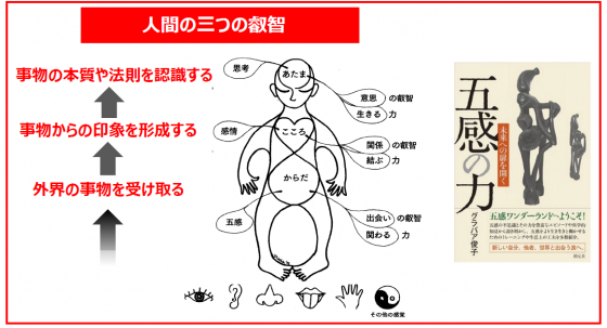 人間には三つの叡智が存在し、「あたま、こころ、からだ」でできている。この図は人が外界を知り、関わるときの流れは下から上へ向かうことを示しています。大切なことはまず五感が外界の事物を受け取る。それが「からだ」、次に「こころ」で事物からの印象を形成する。三つめが「あたま」で、具体的な現われとしての「思考」によって、私たちは事物の本質や法則を認識する。