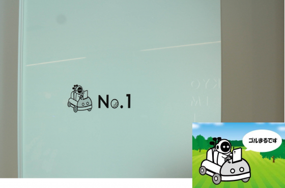 早速見つけました、かわいいサイン!颯爽とカートを操るこのロボット、同社が運営する「Golferweb」の公式キャラ、ゴルまるくんですって!