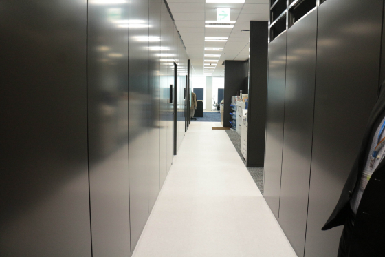 黒いパーテーションでびしっと引き締まりますね。ボウリングできそうな長い通路。通路の右側は手前に倉庫、続いてゴルフ関連サービスのカスタマーセンターのお部屋が用意してありました。