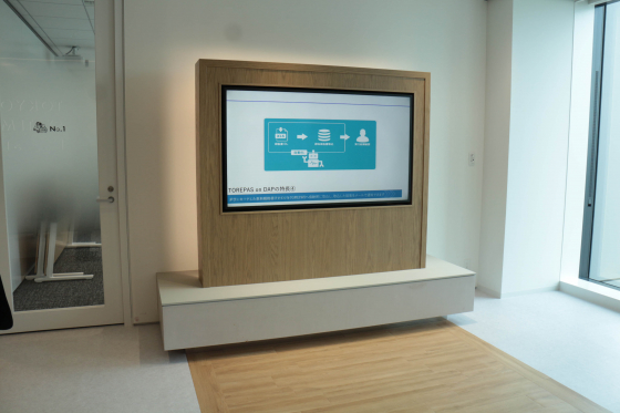 余白がたくさん、シャープなシルバーにロゴが映えてカッコいい。世の中の広報さんはこういう“映えスポット”を欲しているんでしょうね。オフィスに絶対用意しなきゃいけないやつですね。