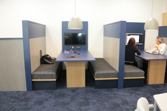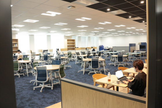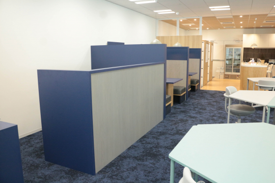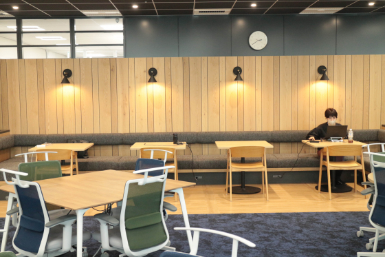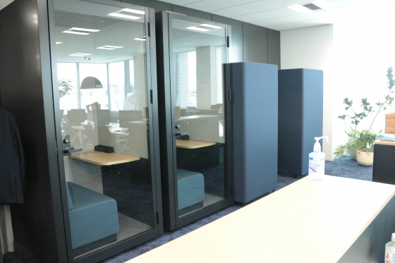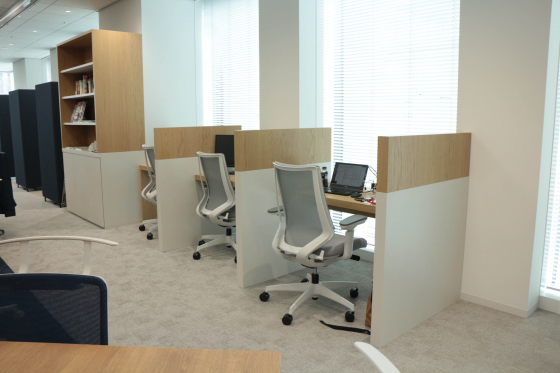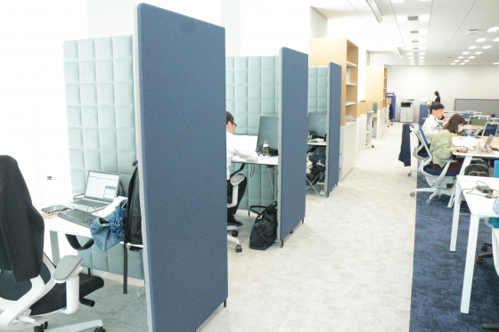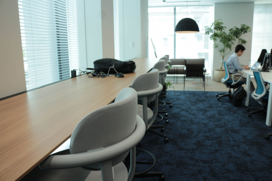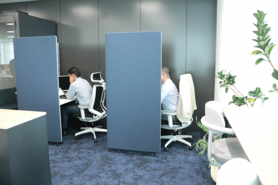 じゃじゃーん、執務スペースです!落ち着いたブルーのトーンで統一されていて大人な雰囲気です。全席フリーでとても静か。今日は比較的出社が少なめの日だそう。