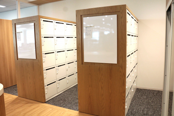 また、この通路の細い部分で、お水や備品類、コピー機や保護る(まもる)くんを格納しているんですね。空間利用が上手!
