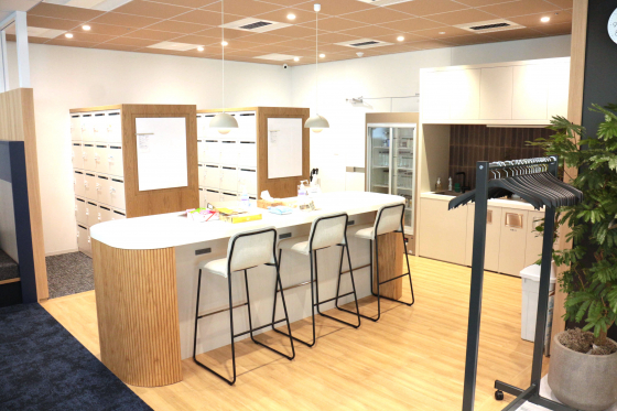 こちらの角はロッカーとパントリー。人が集まるマグネットスペース、床と天井でしっかりエリア分けされています。