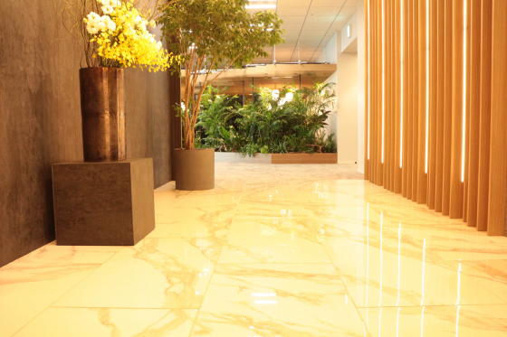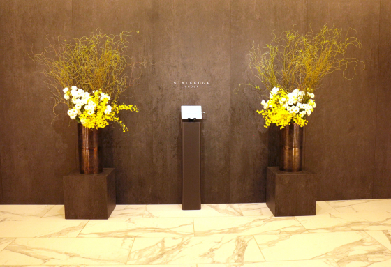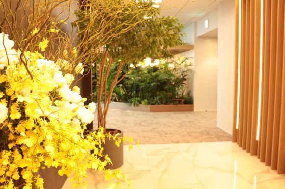 季節の花やグリーンが毎週入れ替わるという、とても贅沢なエントランス!出社のたびに、ホテルに来たような気分です。