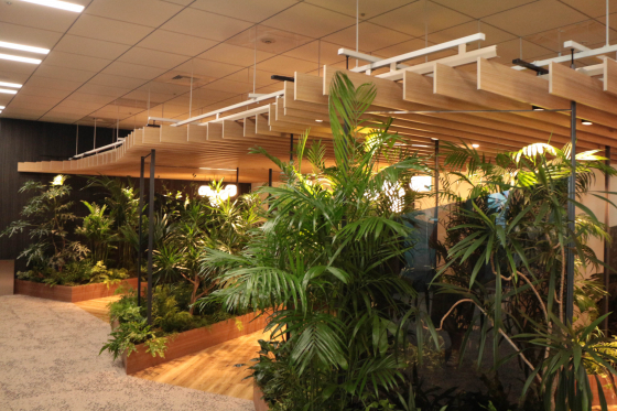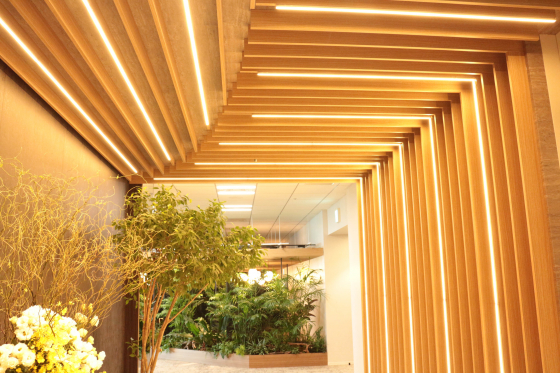 木材のルーバーが天井まで施されていて、中へと導きます。右側へ向かうと会議室が並ぶエリアへ(っていってもグリーンが生い茂る様子しか見えませんが)。逆に左側は執務室へ直結。