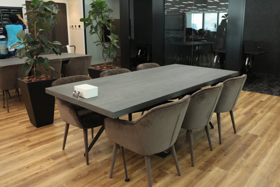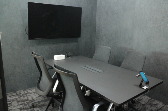 小さめの会議室。グレー一色な感じですがどこか温かみが感じられます。