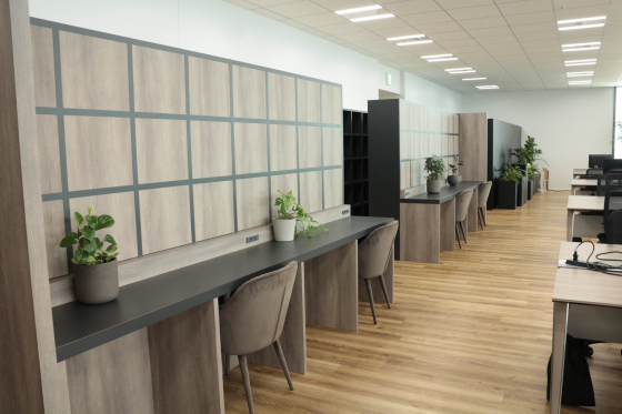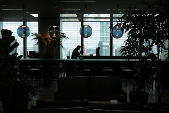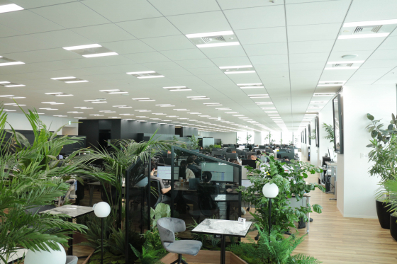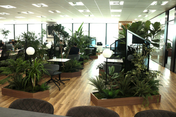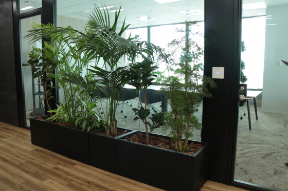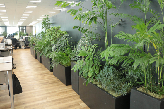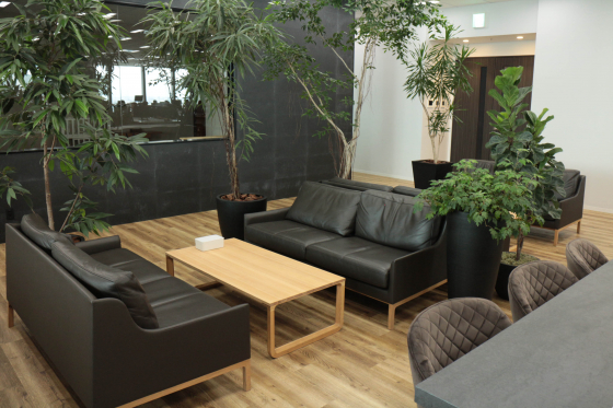 黒基調のコーディネートにとにかくグリーンが豊かで、とてもスタイリッシュなオフィスでした!それでも床の明るい木目のせいか、全体的に重さや暗さを感じさせませんでしたね。またデスクも木目調で明るい雰囲気なのでクールな中にも温かみを感じる家具のセレクトだと思いました。