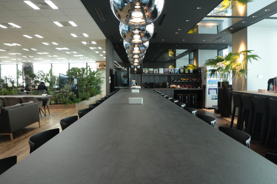 2か所の執務スペースをつなぐ場所にレイアウトされたカフェスペース。なっがーーーーいテーブルとツヤツヤの丸い照明が印象的。