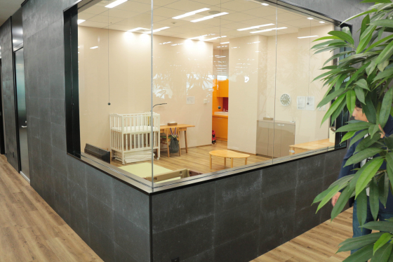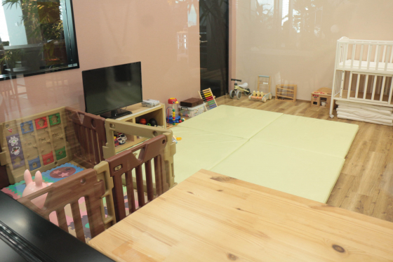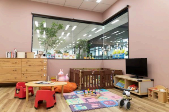 社内託児所「わ~ママStyle Kidsルーム」は、2014年から設置されたもの。普通に考えたら端っことか奥の方にレイアウトしそうな気がしますが、オフィスのほぼ中央に位置しているなんて、いろんな社員さんを見ることができていいですね!