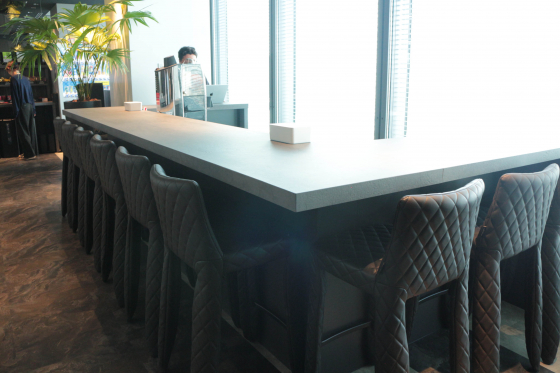 やっと奥まで来ました。カウンター席があって、これまたグリッドが印象的な変わった家具が見えてきましたよ。