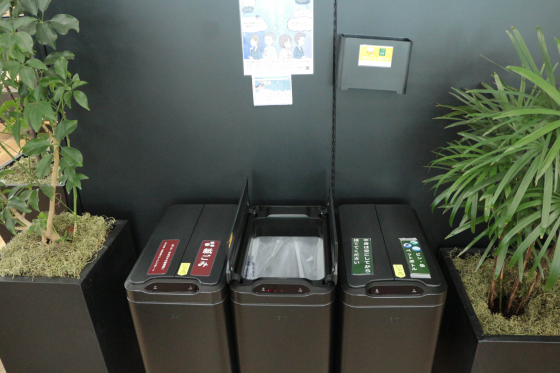 黒いプランターとキャビネットの背中と、モリモリの植栽とで全然ゴミ箱が目立たない!