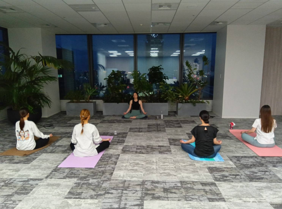 今一番中心になって活動しているヨガ教室。週一回終業後、プロのインストラクターを招き開催。眼精疲労改善ヨガや、免疫力&代謝アップヨガなど、その都度レッスンテーマがあり、5~10名が集まって毎回ワイワイやっています。