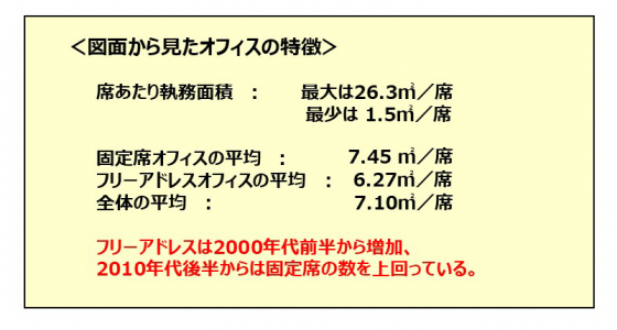 一席あたり固定席の執務面積は7.45㎡、フリーアドレスの場合は6.27㎡。全体平均は7.10㎡となっています。