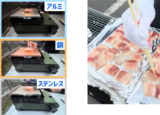 ステンレス・アルミ・銅、3種類の金属プレートで焼いたお肉を食べ比べ、どれが一番おいしいかを投票したんですって!