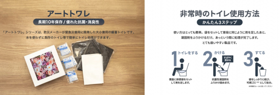| Information | 画像引用および商品詳細はこちら ◎アートトワレ:公式通販サイト ◎水だけで光るライト:コジット防災 ◎アクモキャンドル:アクモホールディングス公式サイト ◎缶入り備蓄パン:パンだ缶 パン&クッキー プレーン味6缶セット |